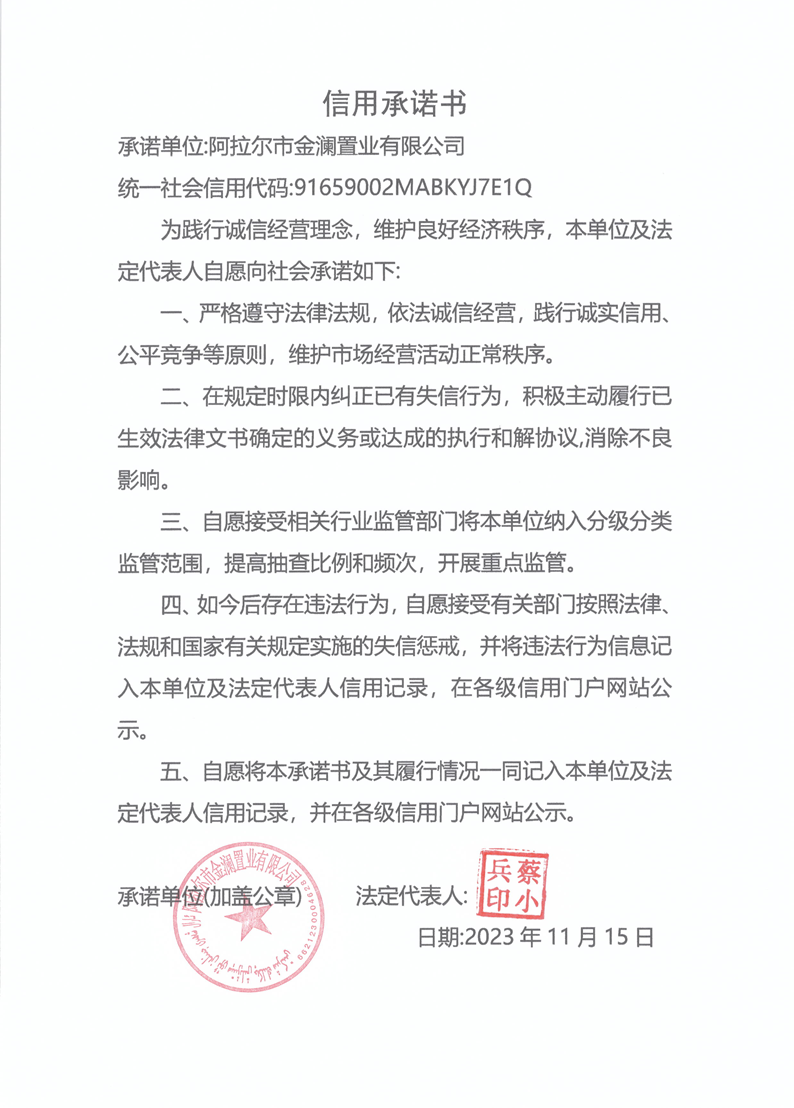 索引号: jsj-2023-00369 发布机构: 住房和城乡建设局 生成日期: 2023-11-15 废止日期: 文 号: 主题分类: 规划计划 关键词: 金澜置业信用承诺书 【打印正文】 【字体:小 大】