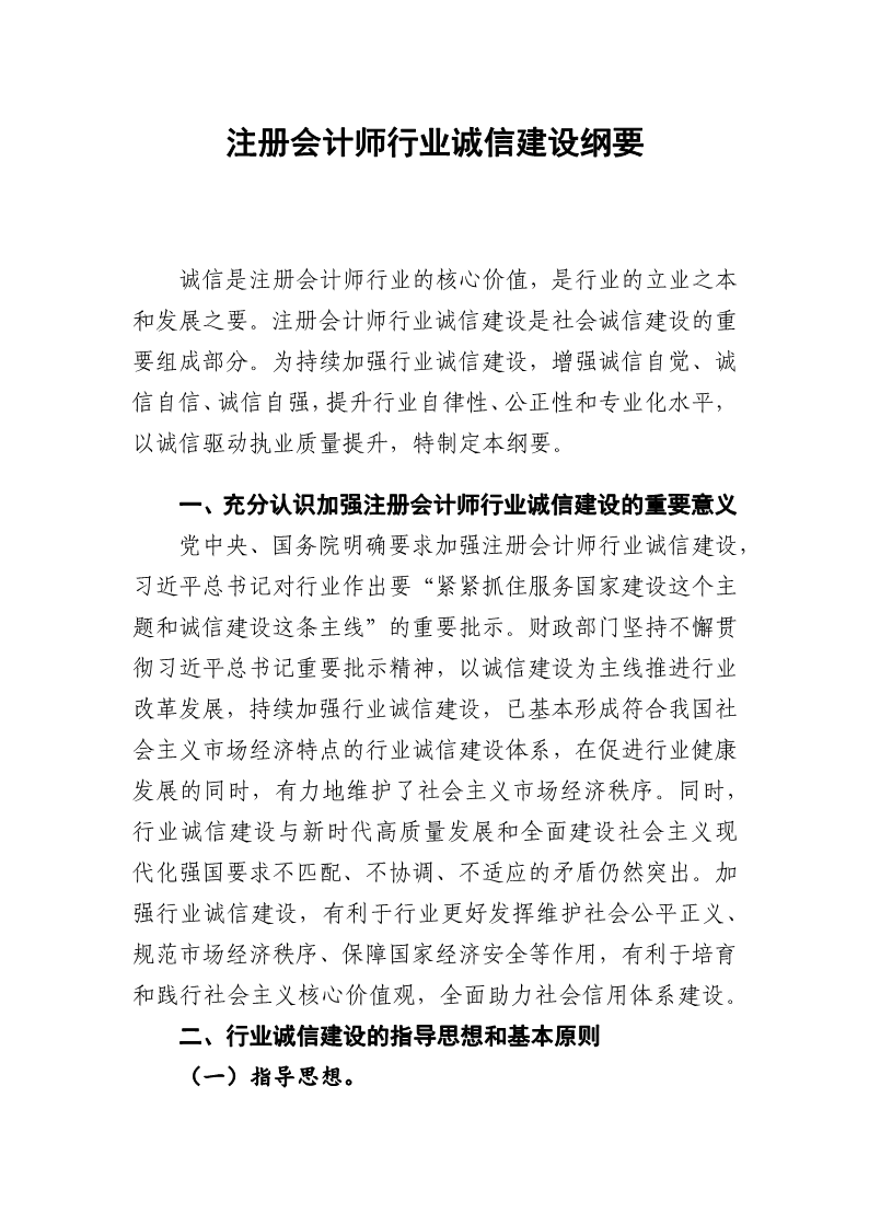 为贯彻落实《中共中央办公厅 国务院办公厅关于进一步加强财会监督工作的意见》、《国务院办公厅关于进一步规范财务审计秩序促进注册会计师行业健康发展的意见》(国办发〔2021〕30号)要求,适应新时代高质量发展和全面建设社会主义现代化强国对注册会计师行业诚信建设提出的要求,增强行业诚信观念,提升执业质量,营造守法经营、诚信服务的行业文化,我部制定了《注册会计师行业诚信建设纲要》,现印发给你们,请结合本地实际,认真贯彻落实。