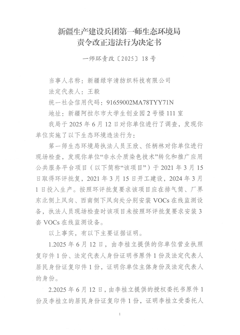 关于新疆绿宇清纺织科技有限公司《责令改正违法行为决定书》18号的公示