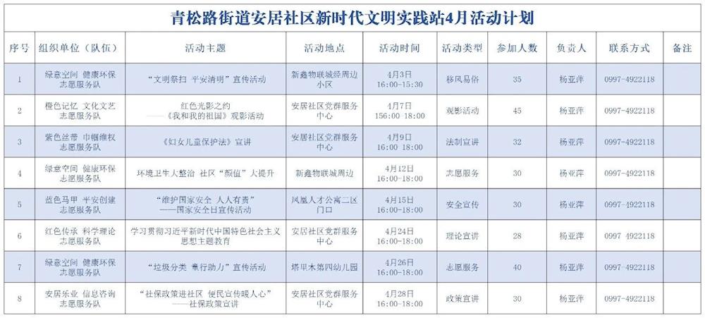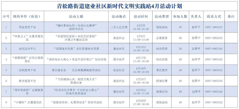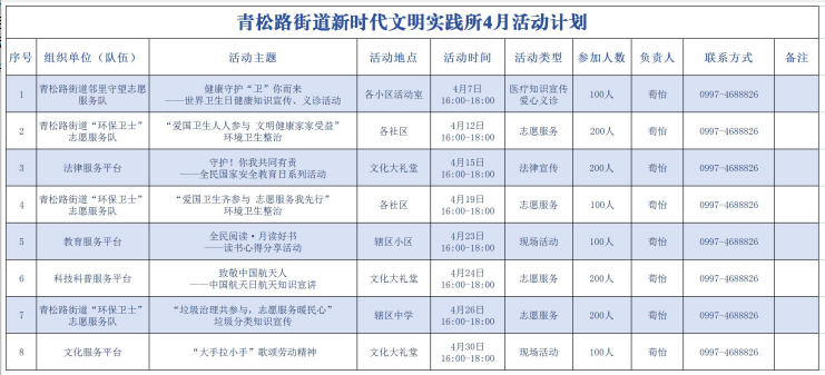 为了深入推进新时代文明实践工作,进一步弘扬奉献、友爱、互助、进步的志愿精神,激发广大居民群众的参与热情,以实际行动彰显新时代文明实践的志愿服务精神。青松路街道新时代文明实践所(站)特别策划了一系列深受群众喜爱的文明实践活动,诚挚邀请广大居民群众根据自身需求和兴趣特长,选择并参加合适的活动。现将青松路街道新时代文明实践所(站)4月份活动计划公示如下: