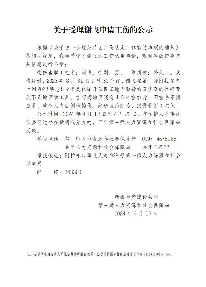 关于受理谢飞等21人申请工伤的公示