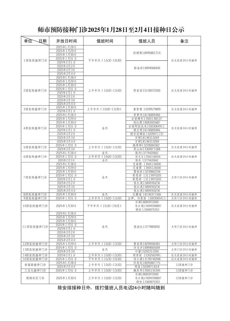 第一师阿拉尔市预防接种门诊2025年1月28日至2月4日接种日公示