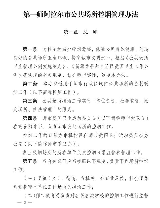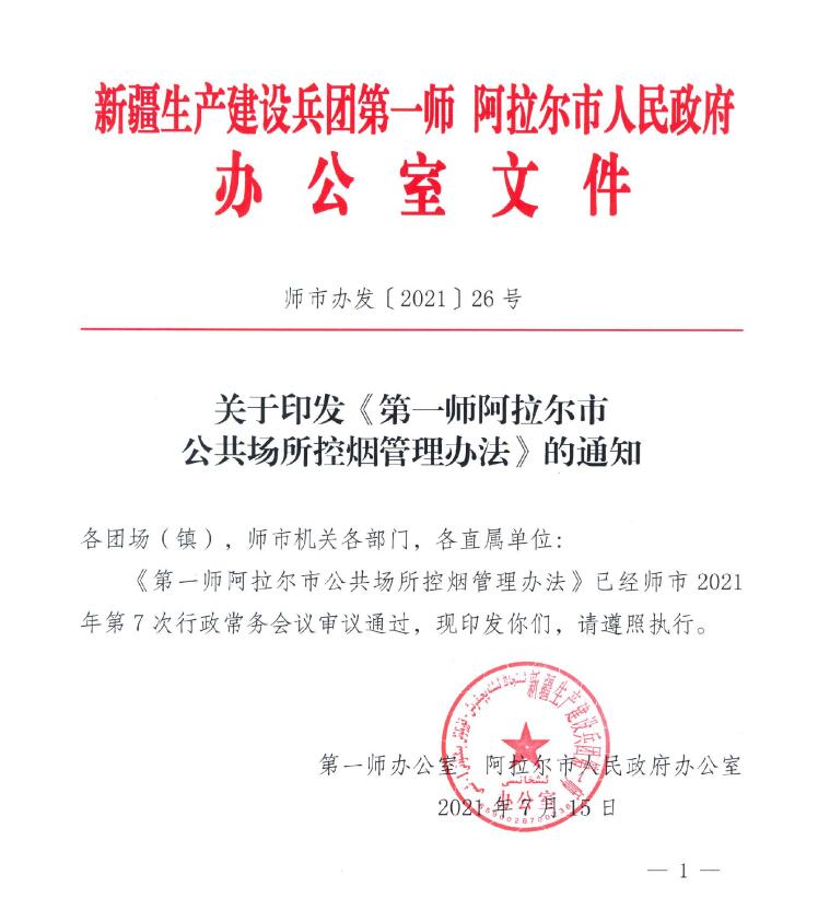 关于印发《第一师阿拉尔市公共场所控烟管理办法》的通知