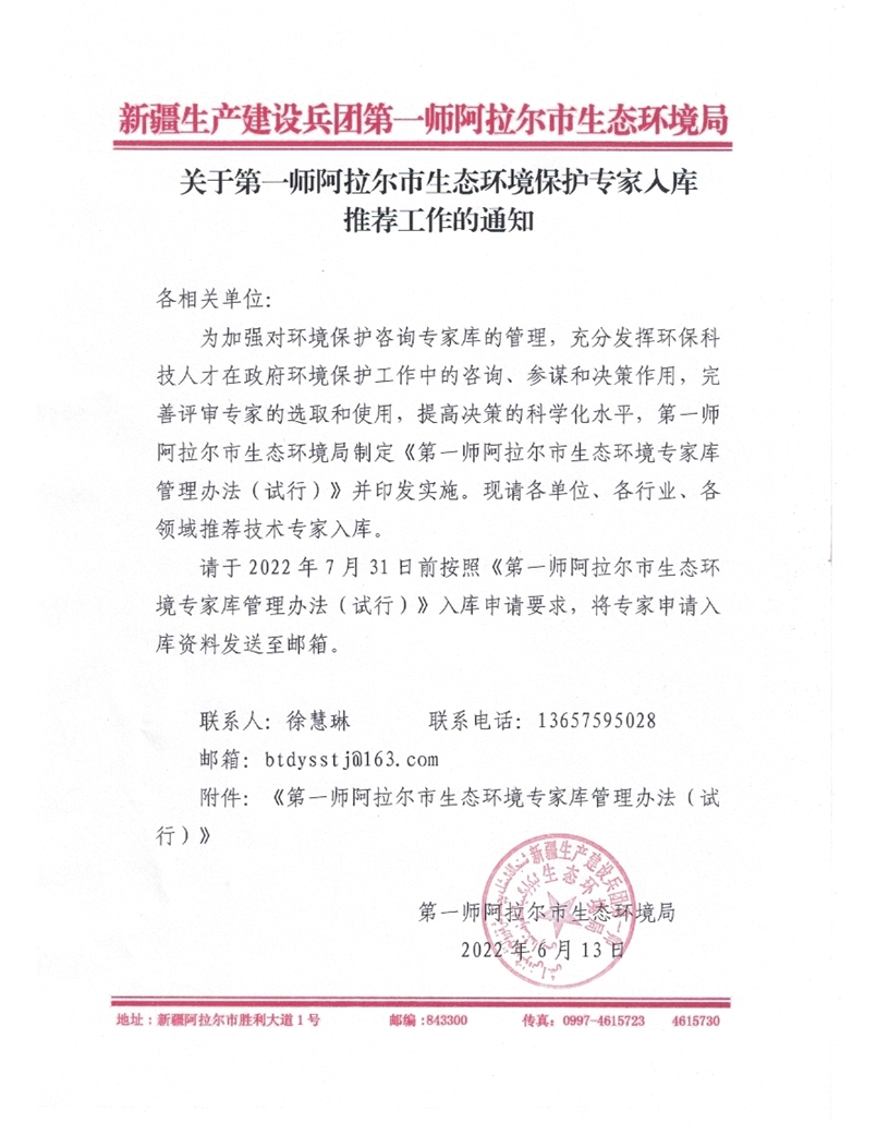 关于第一师阿拉尔市生态环境保护专家入库推荐工作的通知