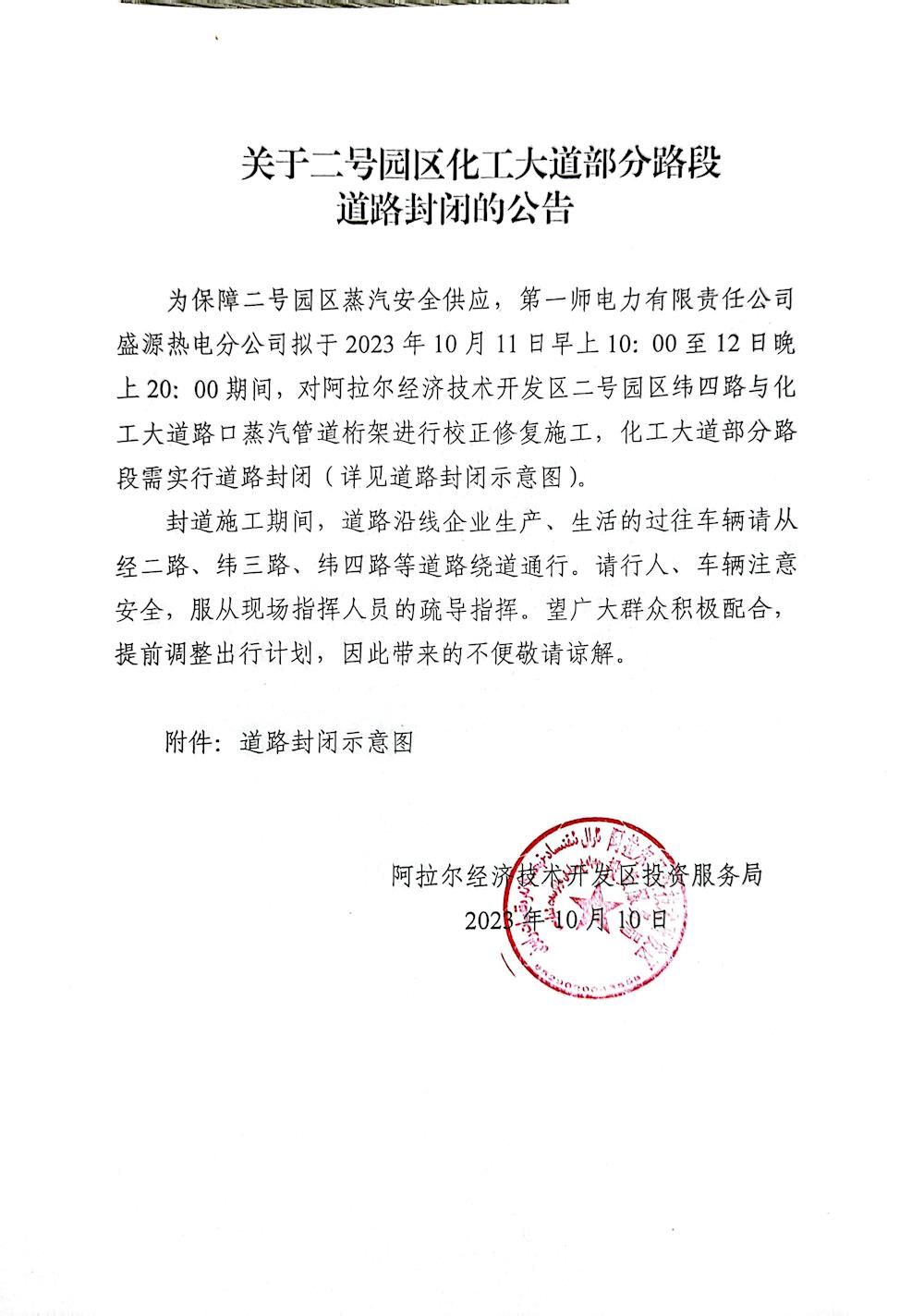 关于二号园区化工大道部分路段道路封闭的公告
