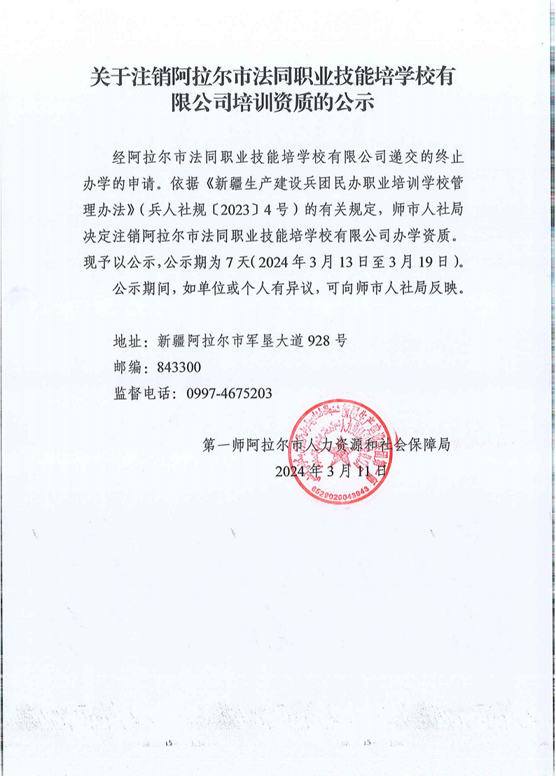 关于吊销阿拉尔市法同职业技能培训学校有限责任公司培训资质的公示
