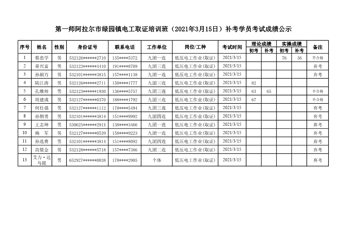 第一师阿拉尔市绿园镇电工取证培训班(2021年3月15日)补考学员成绩公示
