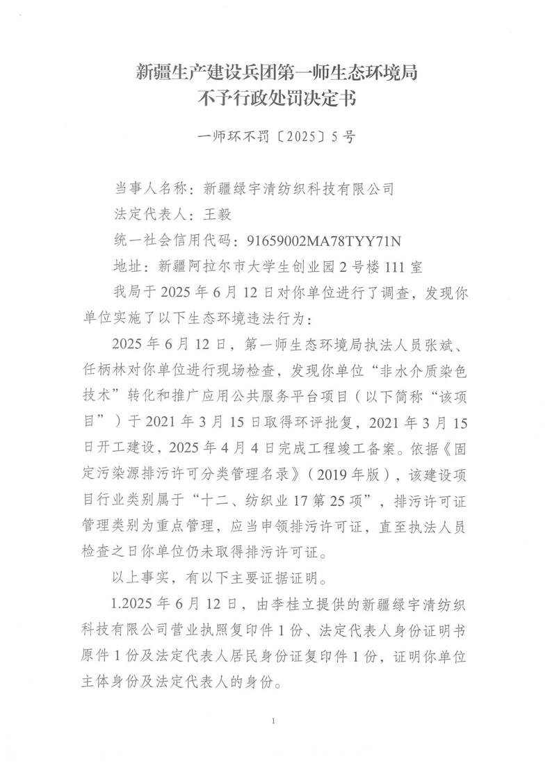 关于新疆绿宇清纺织科技有限公司不予行政处罚决定(一师环不罚〔2025〕5号)的公示 来源:生态环境局 发布时间:2025-09-08 19:20:08 浏览次数: 次 【字体:小 大】 终审:生态环境局 【打印正文】